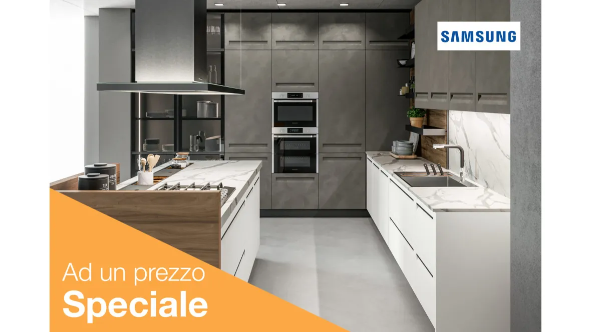 Acquista una cucina Arredo3 completa di 4 elettrodomestici Samsung a scelta tra piano cottura, forno, frigorifero, lavastoviglie e microonde, per te un prodotto a scelta tra la Smart Tv UHD 4K 55", la lavatrice o l'asciugatrice a prezzo speciale.
